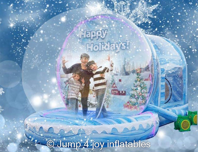 Step Right up, or should we say inside our giant inflatable snow globe rental! These amazing new structures are the perfect photo opportunity at your next event. A Holliday party favorite, thats for sure! Gather around while your guests step into the entrance chamber in the back of the snow globe then enter in front of the themed backdrop. Strike a pose or two while you get some everlasting memories created. Each snow globe can be decorated inside for additional holiday decor. Perfect idea for Christmas parties or those Winter Wonderland events. These amazing snow globes can be used indoors or outdoors. Our snow globe can fit up to 5 guests inside at one time. Just enter, strike a pose, snap a photo with camera or phone and you'll have a memorable photo souvenir to share with your family and friends. At Jump 4 Joy Inflatables we also have other theme backdrop available for various holidays and events. Consult with our office staff for more information. IMPORTANT NOTE: Although they may look like it, THESE ARE NOT BOUNCE HOUSES. They are NOT designed to be jumped in by any means. Please don't rent a snow globe with the intent to allow your guests to jump inside as it may cause injury or damage to the inflatable snow globe.