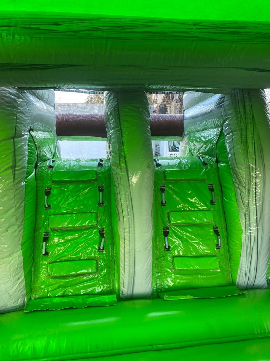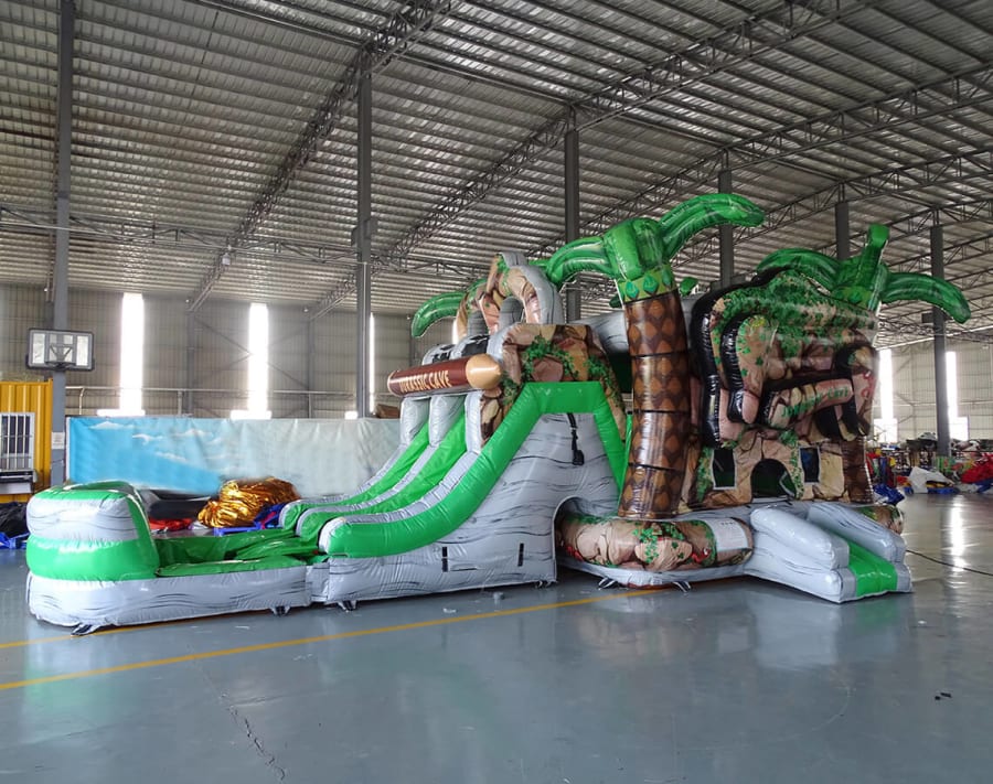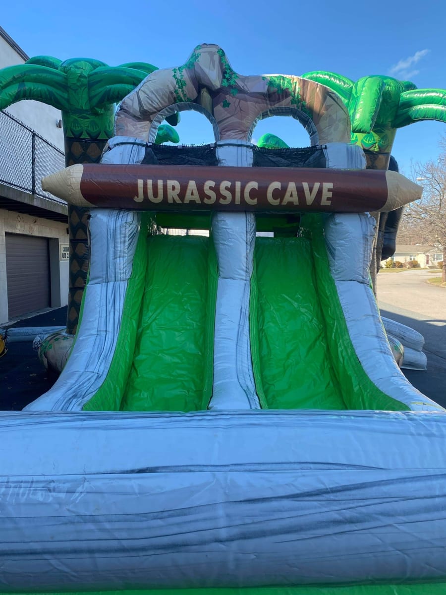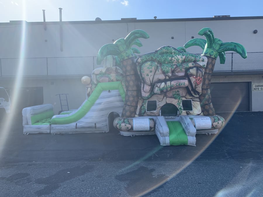 WELCOME TO THE JUNGLE BABY!!! Get ready to impress your friends and guests with our Jurassic Cave Combo Wet/Dry at your next party event. With its sleek looks, vibrant colors with 3D palm trees, It will tower the competition! Great for all ages, as kids and adults will have a great time with it"s large jump area, 2 basketball hoops inside unit, double climb wall, dual lane slide, Customers can order this combo Dry or with Pool however they see fit for your party needs. Our combo will Hold up to 6-8 kids of equal size at a time in bounce house. With the many options that this combo offers it can be a real big hit in spring, summer time, and fall party events. We want our clients to know that, WE JUST DON'T PROMISE.............WE DELIVER!!! To see if we deliver and service your area check out our DELIVERY AREAS PAGE. You can easily reach out to us on our CONTACT PAGE or call us at 401-413-3268 24/7 ONLINE ORDERING! JUST CLICK THE GREEN BUTTON BELOW. MAKE SURE TO FOLLOW US ON https://www.facebook.com AS WE UPDATE NEW INVENTORY FREQUENTLY.