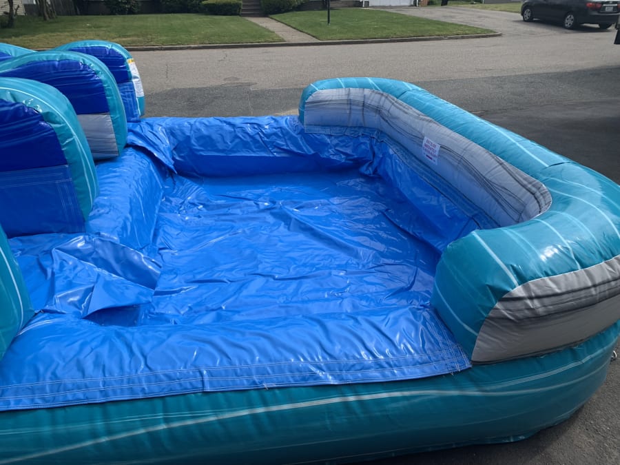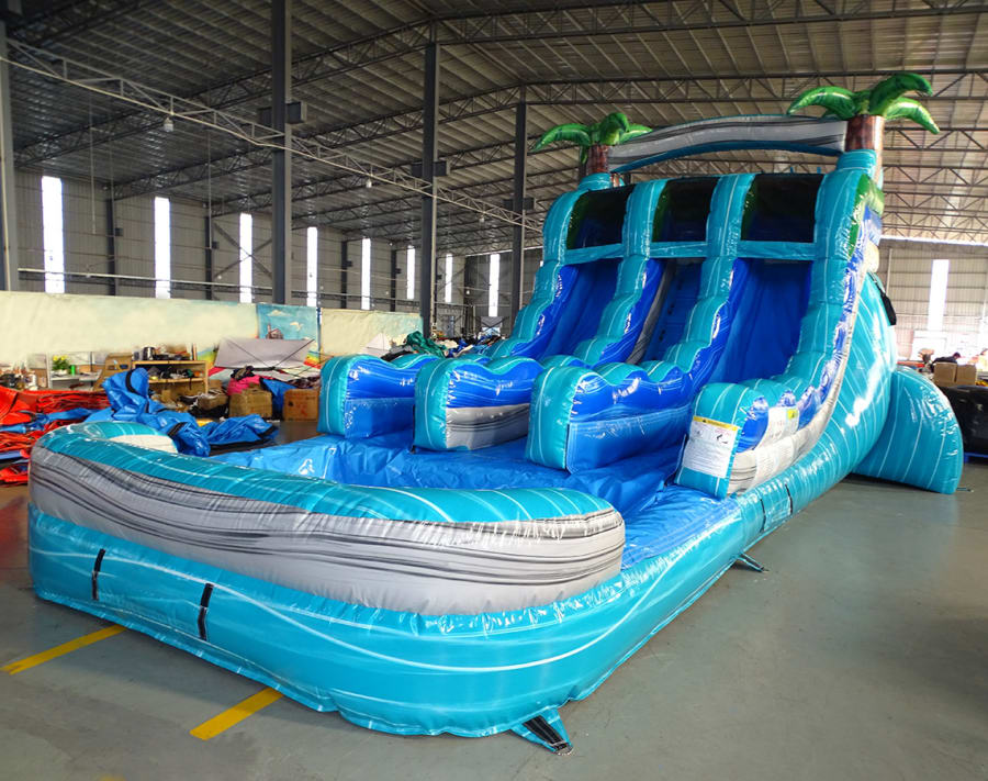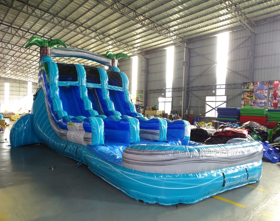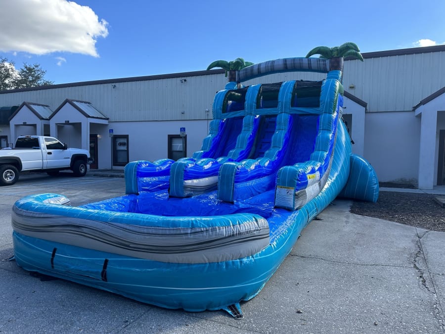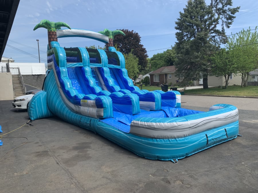 Are you looking for a waterslide for your next party event ? Our Island Breeze Dual Lane Waterslide is truly ideal for any type of event. With its 3D palm trees, vibrant sleek blue colors, This unit will bring some excitement to any party event such as birthdays, first communions, schools functions, corporate event,. and backyard parties. Have your guests beat the heat at your party by climbing the middle foam steps to top platform, sit down, and get ready to slide down to a refreshing pool! So why wait, WE MAKE FUN EASY!! Order one today!! To see if we deliver and service to your area check out our DELIVERY AREAS PAGE. You can reach us on our CONTACT PAGE or call us at 401-413-3268 24/7 ONLINE ORDERING! JUST CLICK GREEN BUTTON BELOW.