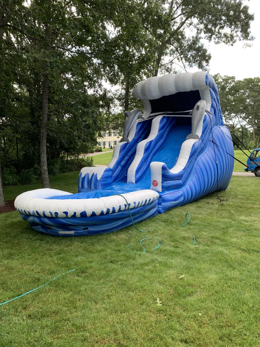 Our Dolphin Double Drop Waterslide With Pool is great for kids and adults! This single lane waterslide is great for birthdays, schools, first communions, and back yard events. Have your guests excited sliding down our waterslide in to a big pool area that will keep the party going with friends and family. To see if we deliver to your area check out our Delivery areas page. You can reach us on our contact page or call us at 401-413-3268