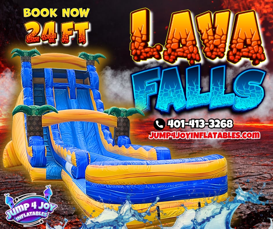 Are you looking for a thrilling addition to your next party event ? Look no further than our 24 foot Lava Falls Waterslide!! Grab a friend to slide down with side by side in a friendly competition in this MASSIVE waterslide and see who splashes down first!! Great for graduations, birthdays, backyard BBQ events!! To see if we deliver and service to your area with inflatable fun rentals check out our DELIVERY AREAS PAGE. You can reach out on our CONTACT PAGE or call us at 401-413-3268 24/7 ONLINE ORDERING! JUST CLICK THE GREEN BUTTON BELOW.